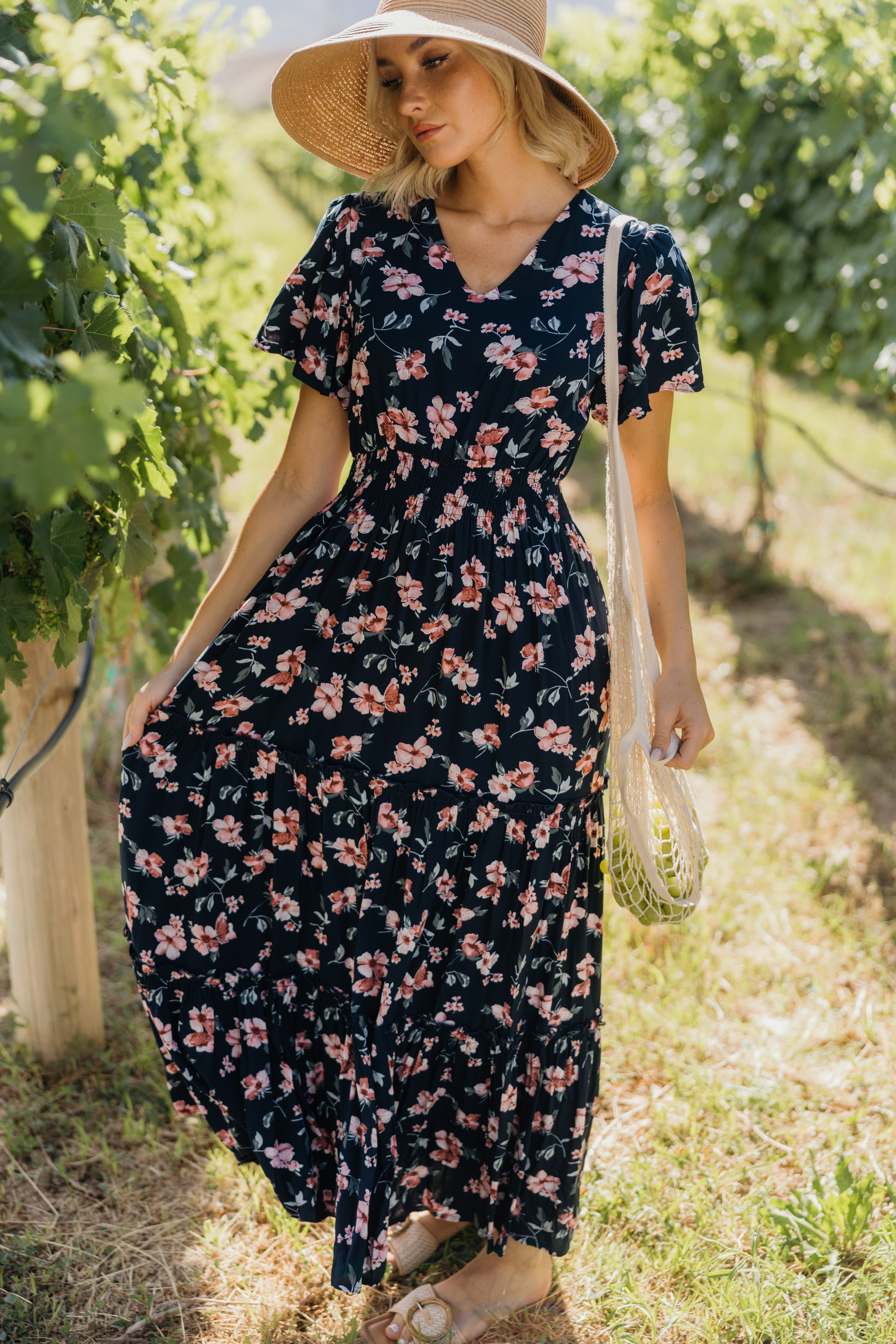 This maxi dress with a natural beauty is made with a woven fabric with a floral print on a navy background and is fully lined (including the sleeves). It also features a lovely and full flutter sleeve, a v-neck, a shirred elastic waist, and a very long tiered skirt.