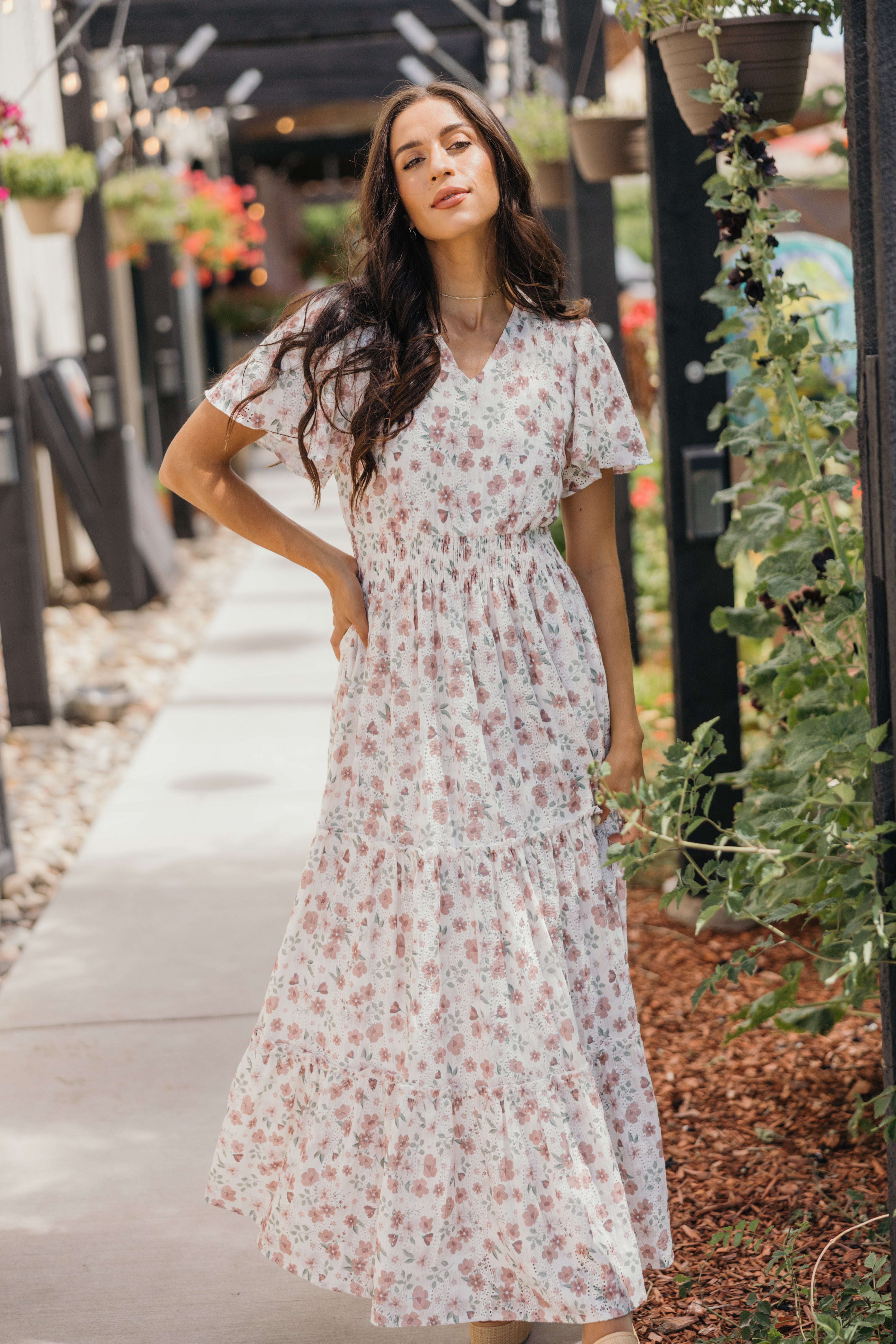 This maxi dress with a natural beauty is made with a woven fabric with a pink and green floral print on a cream background and is fully lined (including the sleeves). It also features a lovely and full flutter sleeve, a v-neck, a shirred elastic waist, and a very long tiered skirt.
