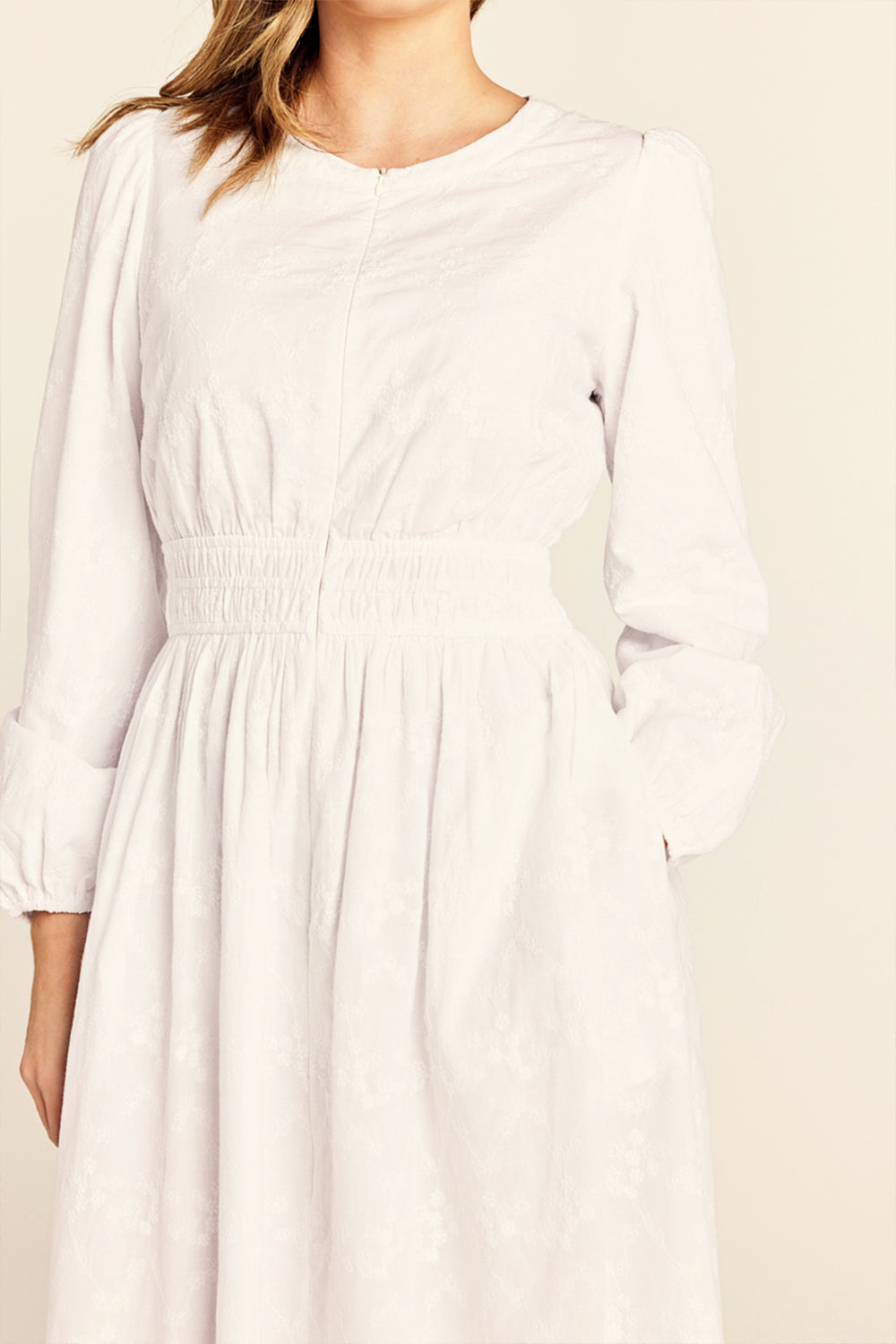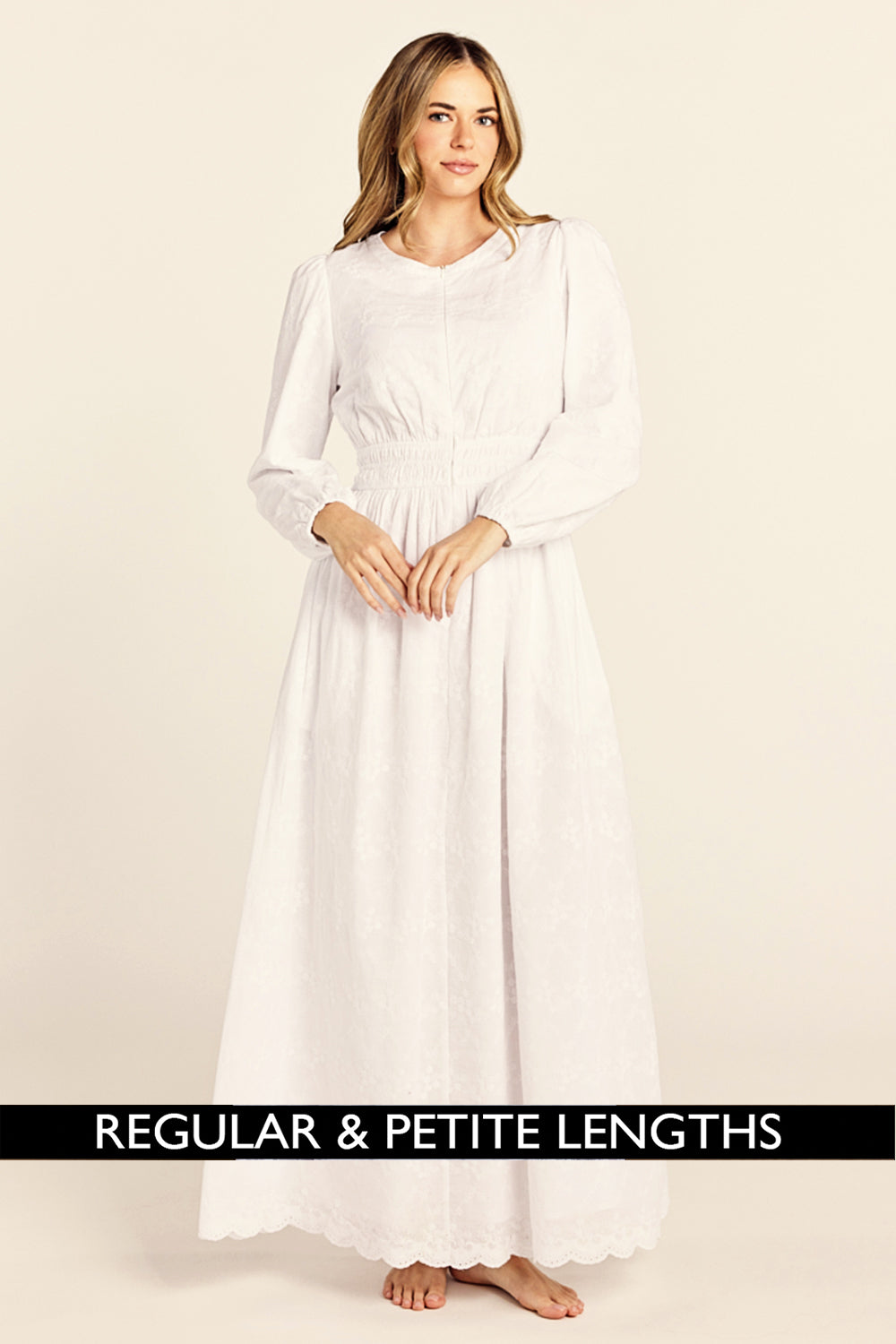 Introducing the Ellen—your new favorite temple dress that's as practical as it is pretty! This charming white dress features a convenient front zipper for easy on-and-off, paired with a comfy elastic waist that moves with you. The round neckline and long sleeves (complete with wrist elastic) keep things modest and put-together, while delicate lace trim at the hem adds a touch of elegance. Fully lined for comfort, plus functional pockets because who doesn't love a dress with storage? Crafted from 100% cotton, it's breathable and easy to care for.