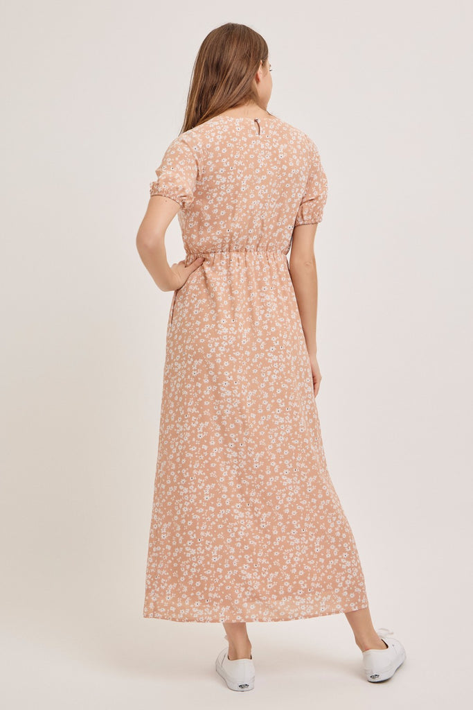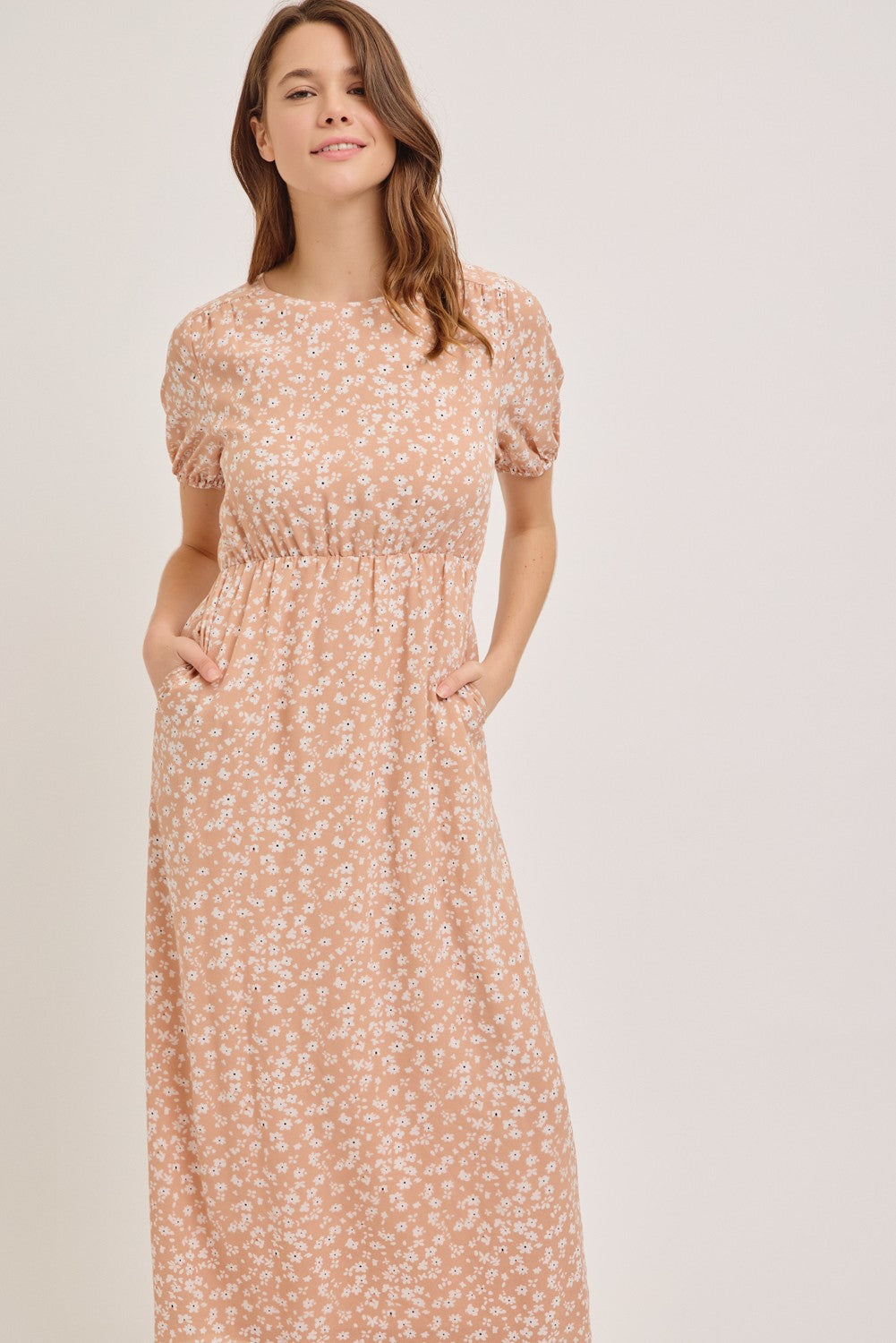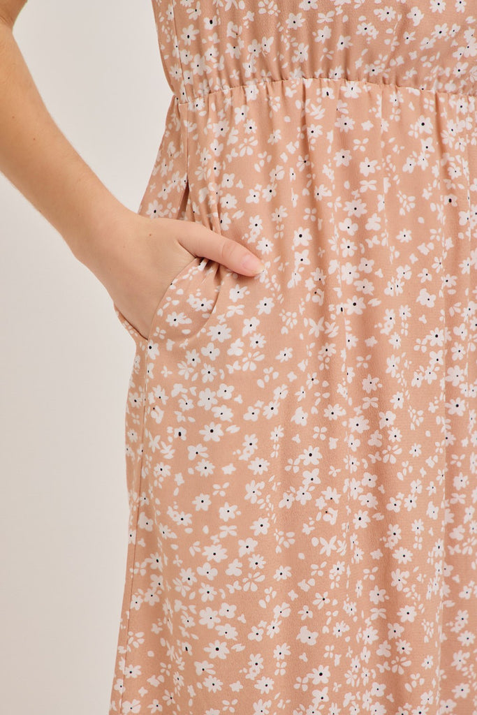 Step into spring with our Felicity Floral Print Midi Dress! This blush beauty features adorable cream daisies dancing across the fabric. Complete with convenient pockets, a comfy elastic waist, short sleeves, and a full lining—it's the perfect twirl-worthy addition to your wardrobe!