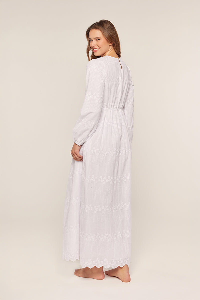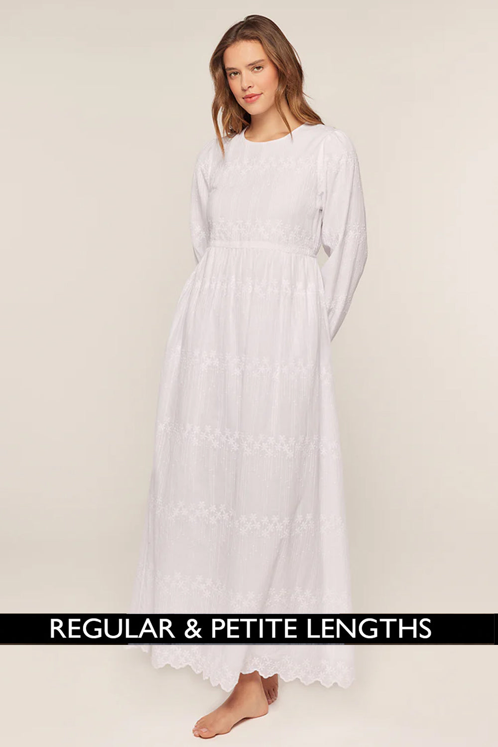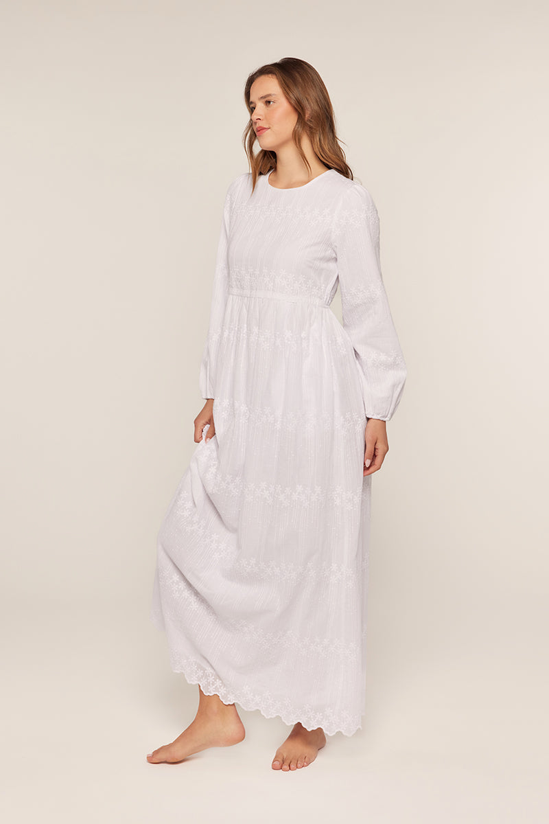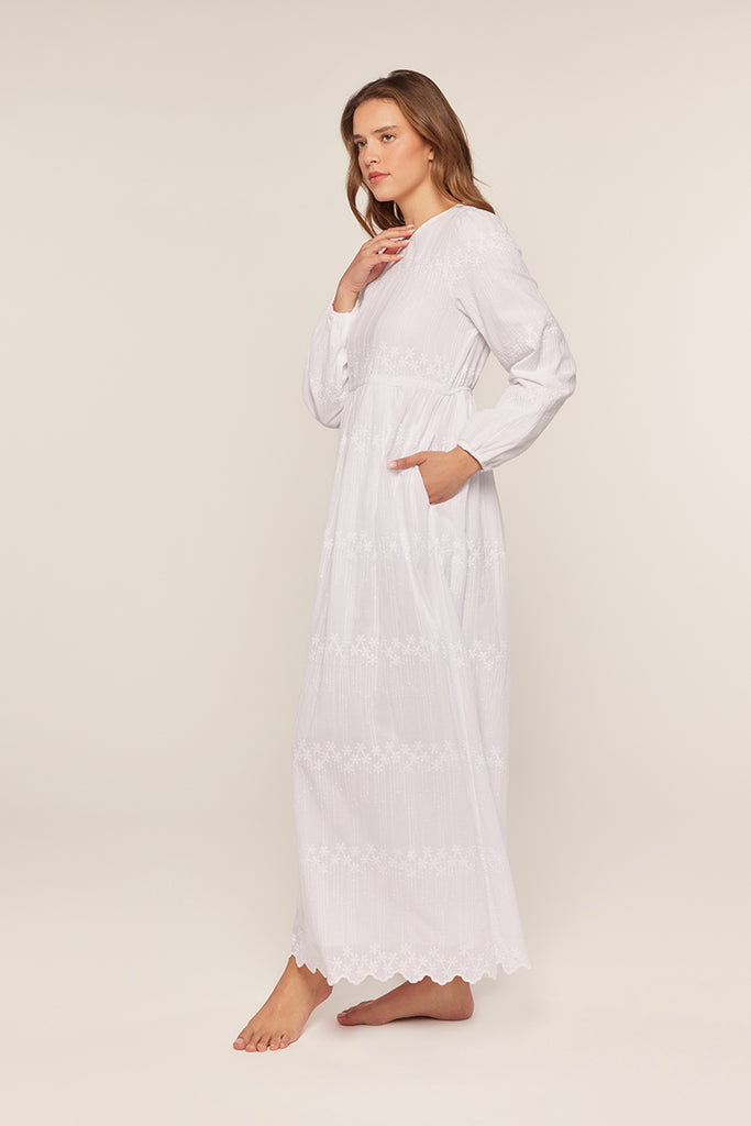 This elegant cotton maxi is the perfect temple dress! It is fully lined, including bodice and sleeves, has inseam pockets, elastic waist and button in back. Beautiful flower detailing, including scalloped edges on the bottom of the dress