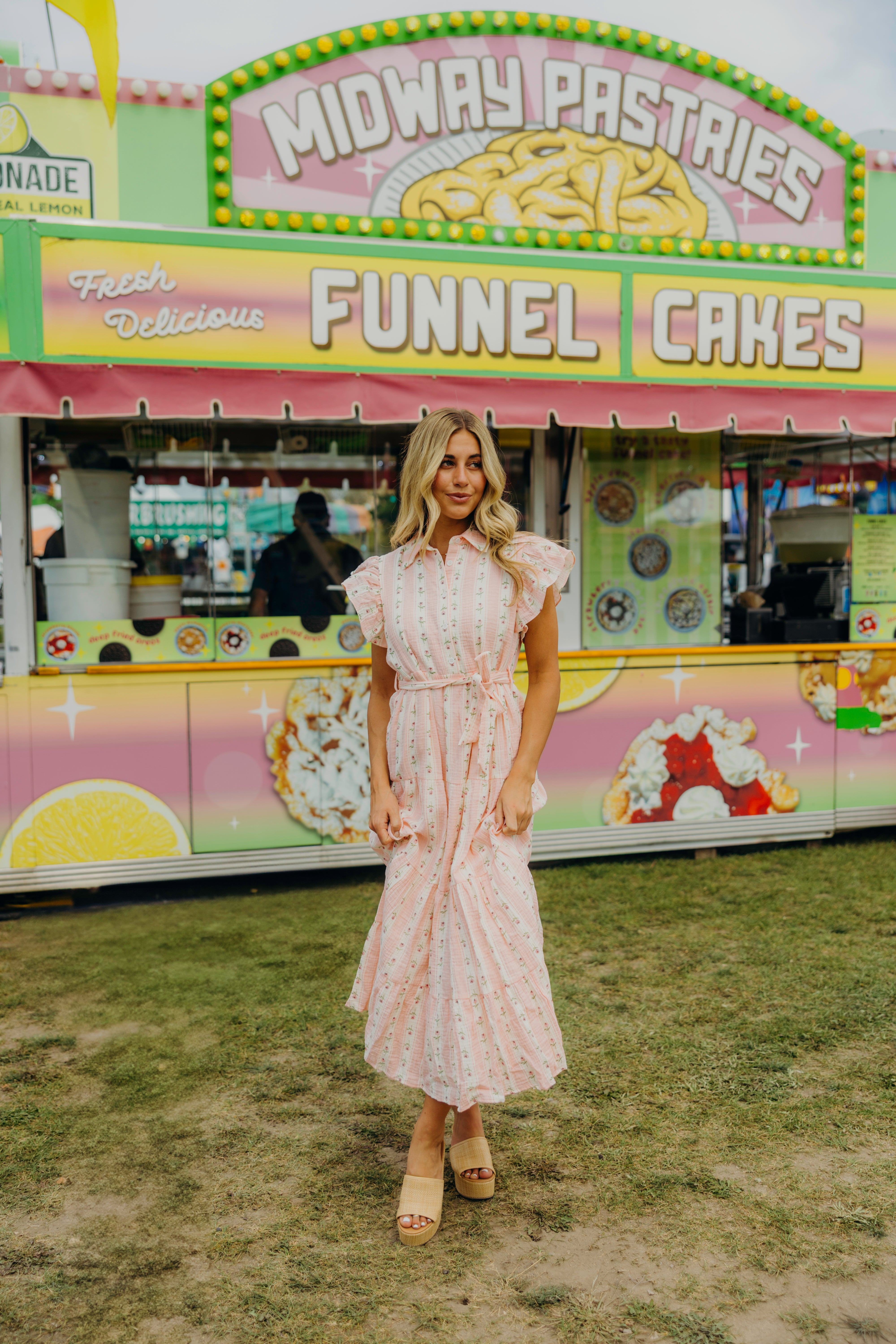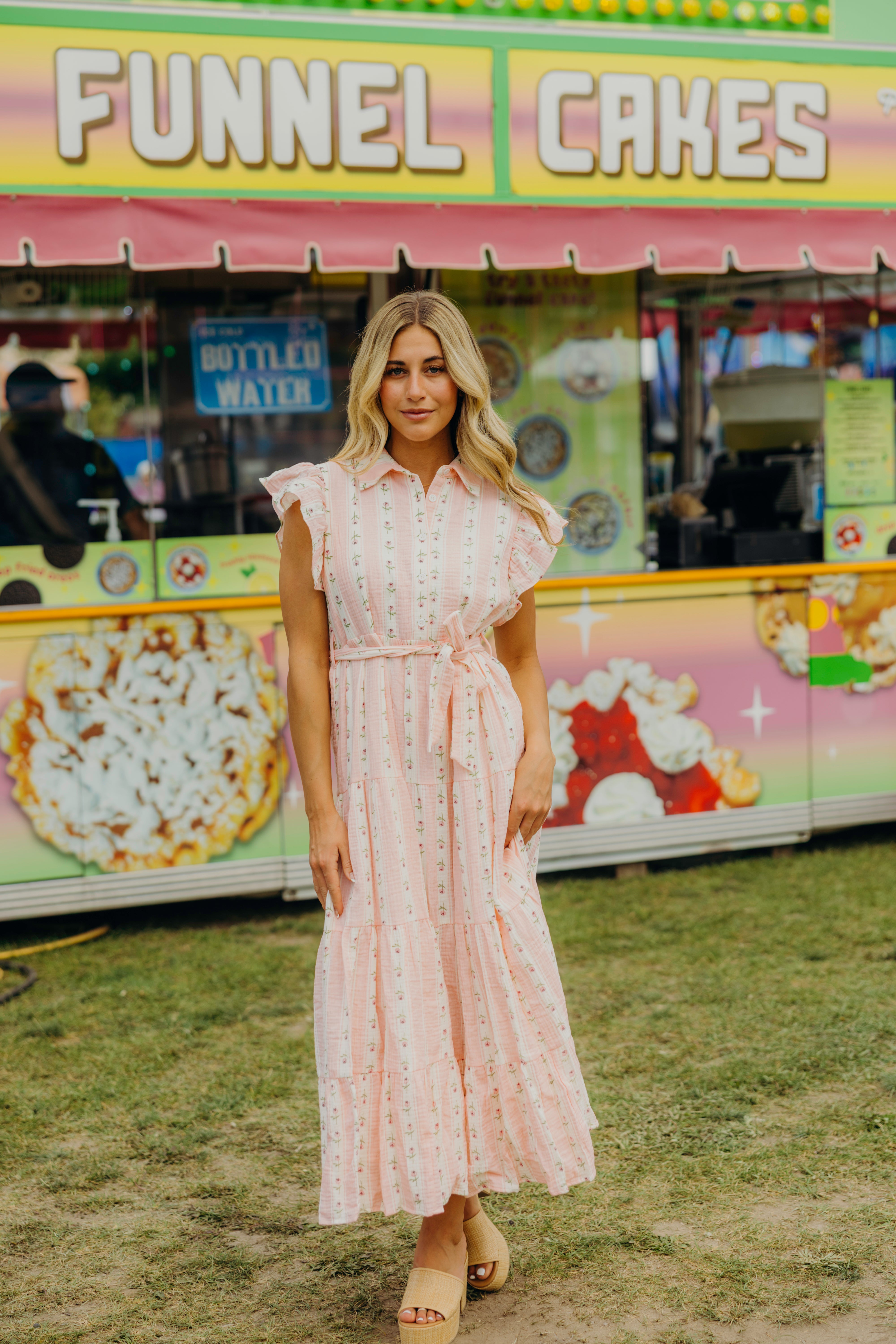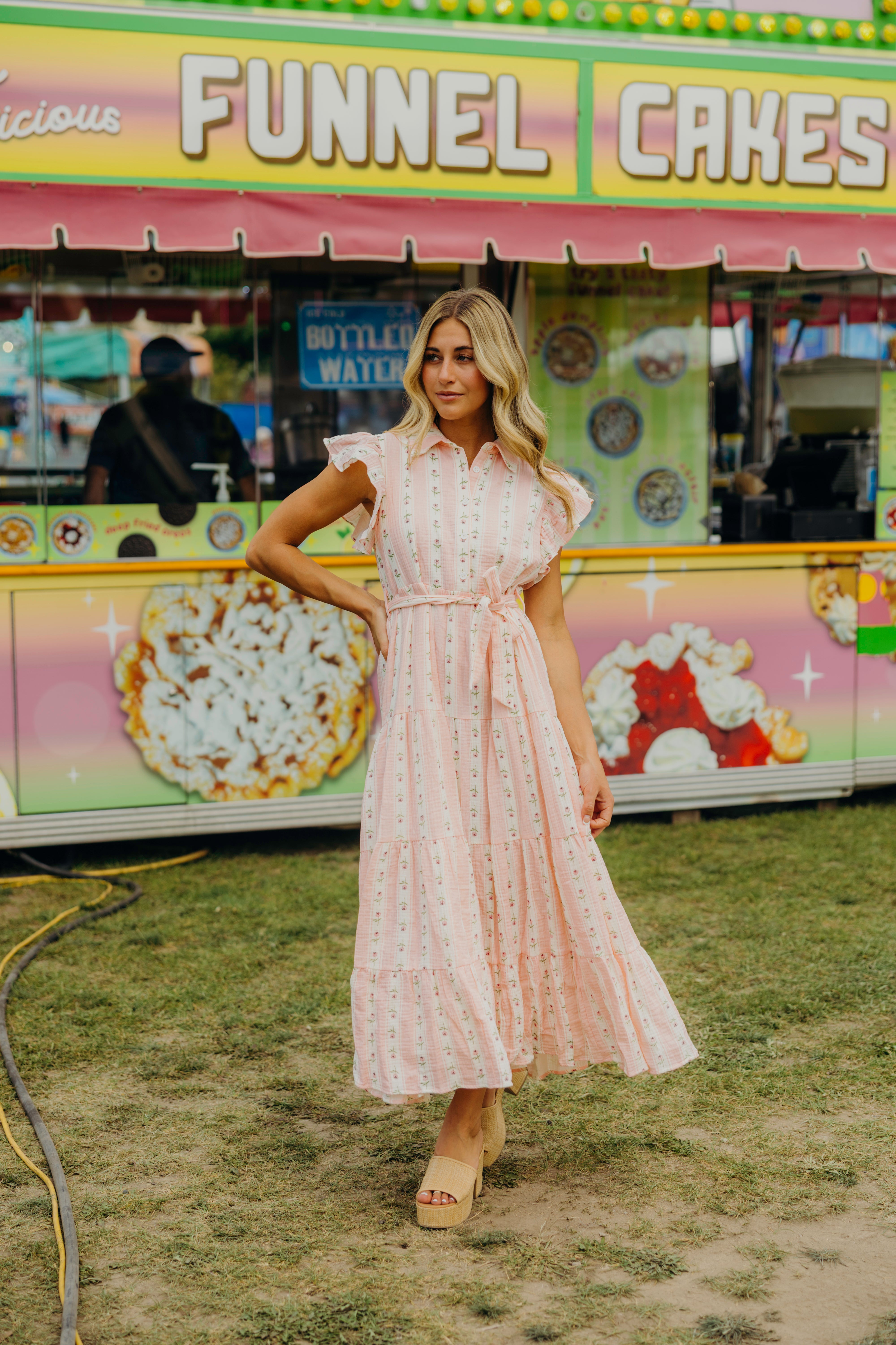 Slip into the enchanting Goldie Dress with pink and cream strips, and a charming pink floral pattern with flirty ruffle sleeves and a classic collar. With its playful button-down front, flattering waist tie, and bouncy tiered design, this beauty is ready for whatever adventures your day holds!