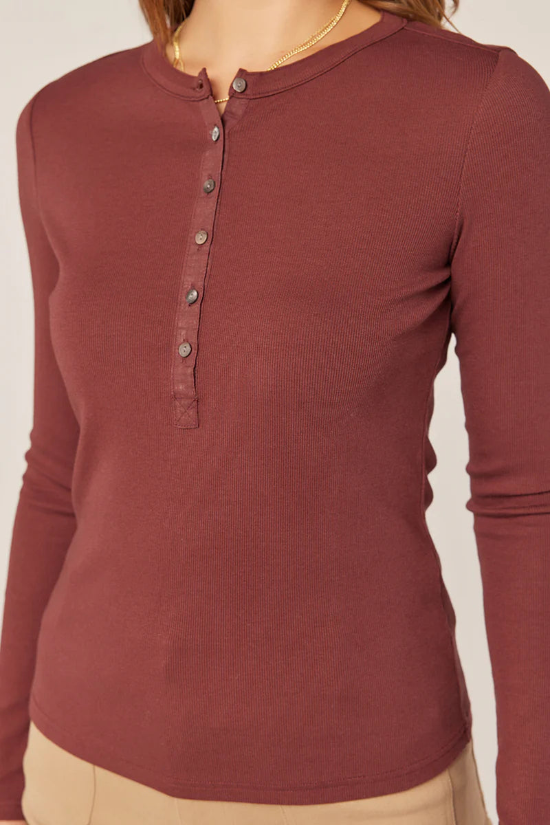 The Jade Half Button Long Sleeve Top in Wine