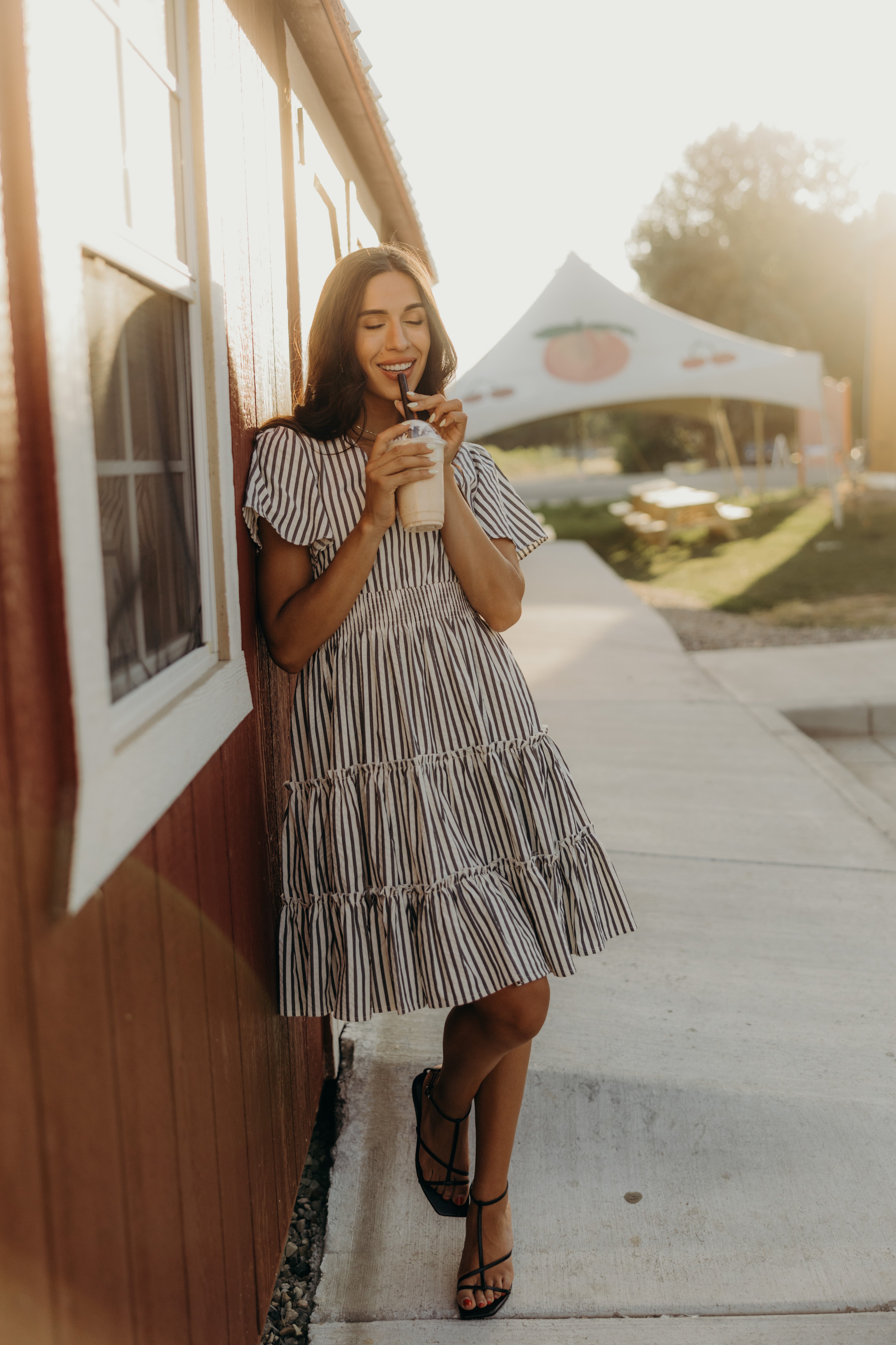 This short and sweet midi dress features a charcoal gray and cream pattern. It is also fully lined and has a v-neckline, short fluttery sleeves, a shirred, elastic waist, and a full, tiered skirt with small ruffle bordering along the skirt tiers.