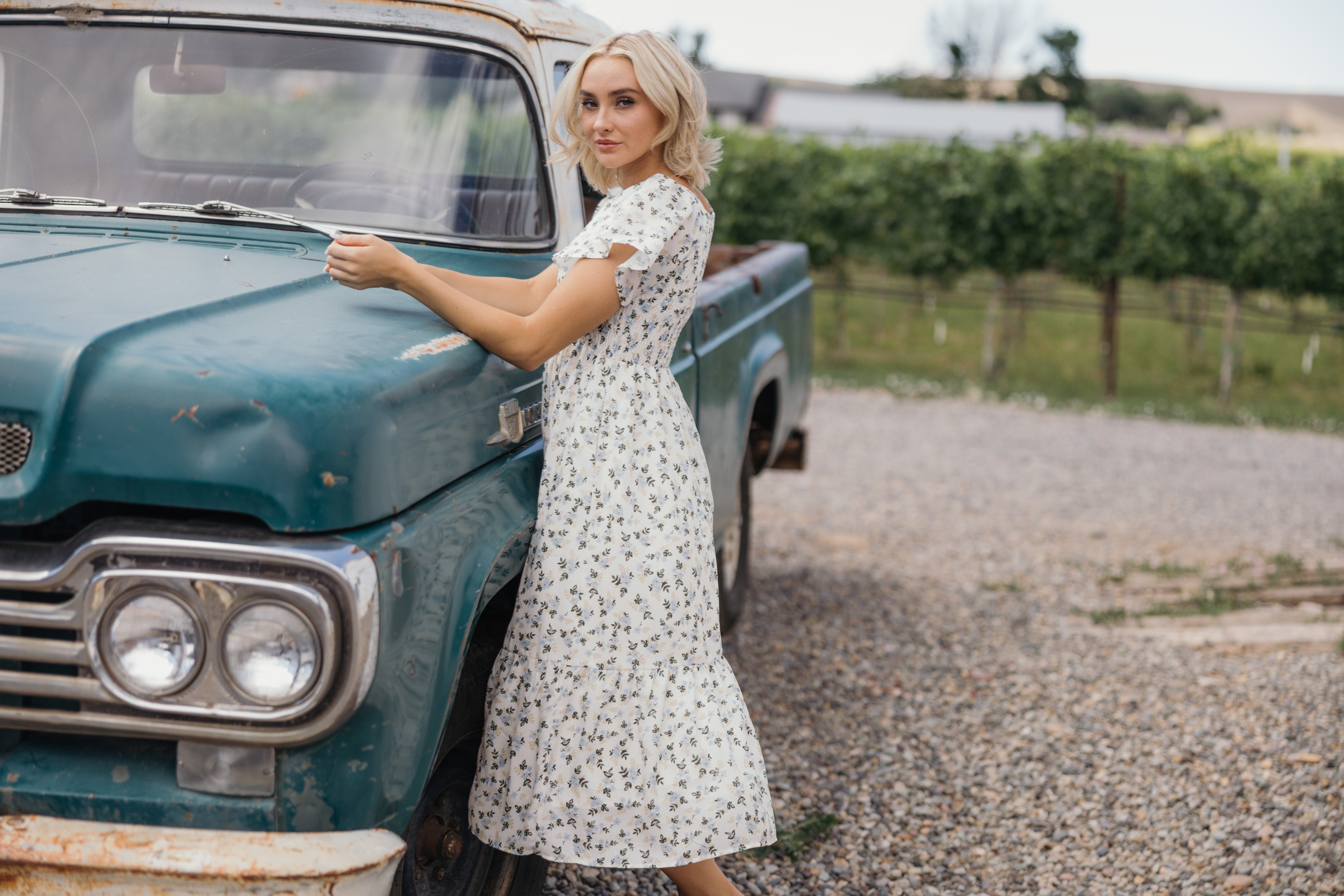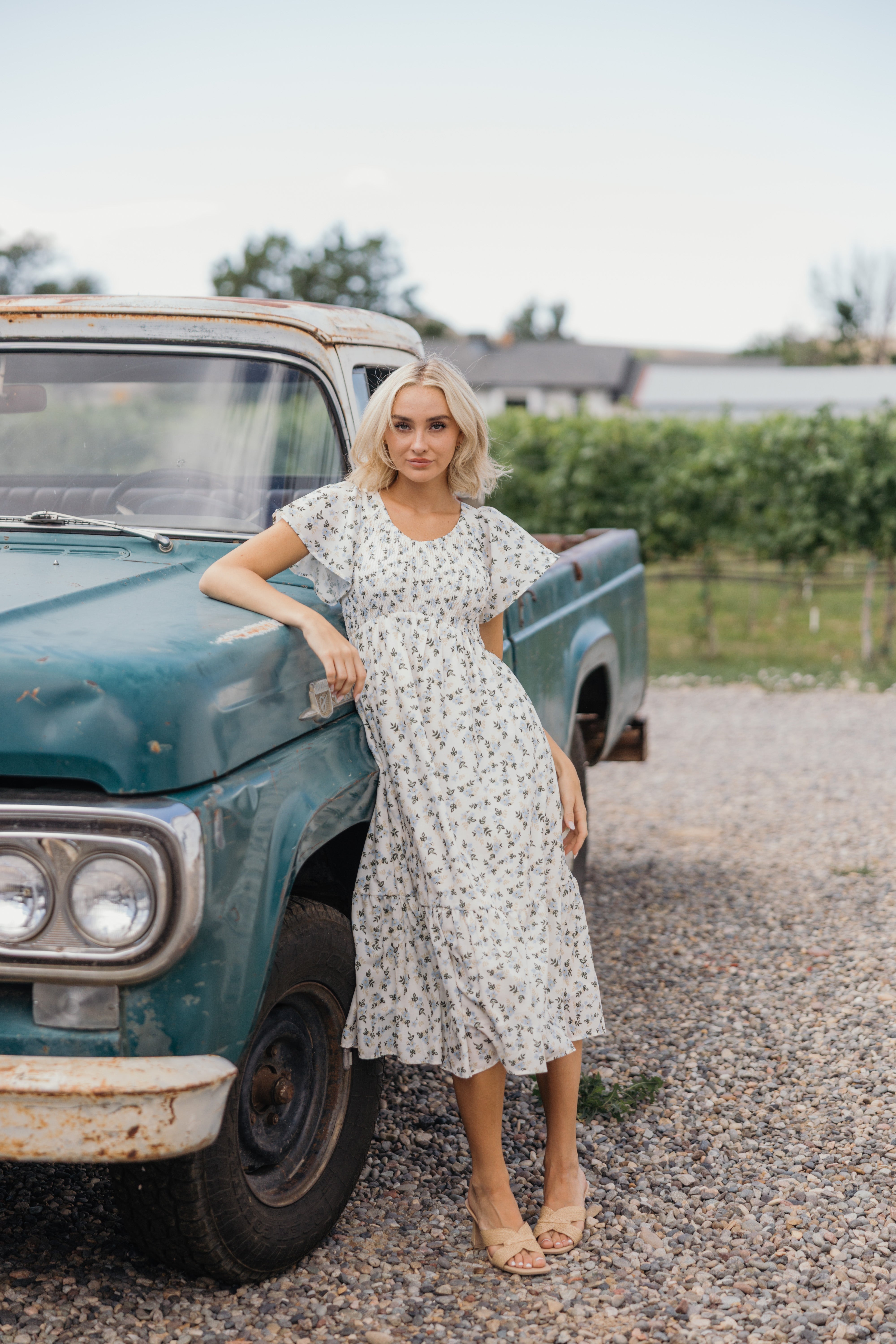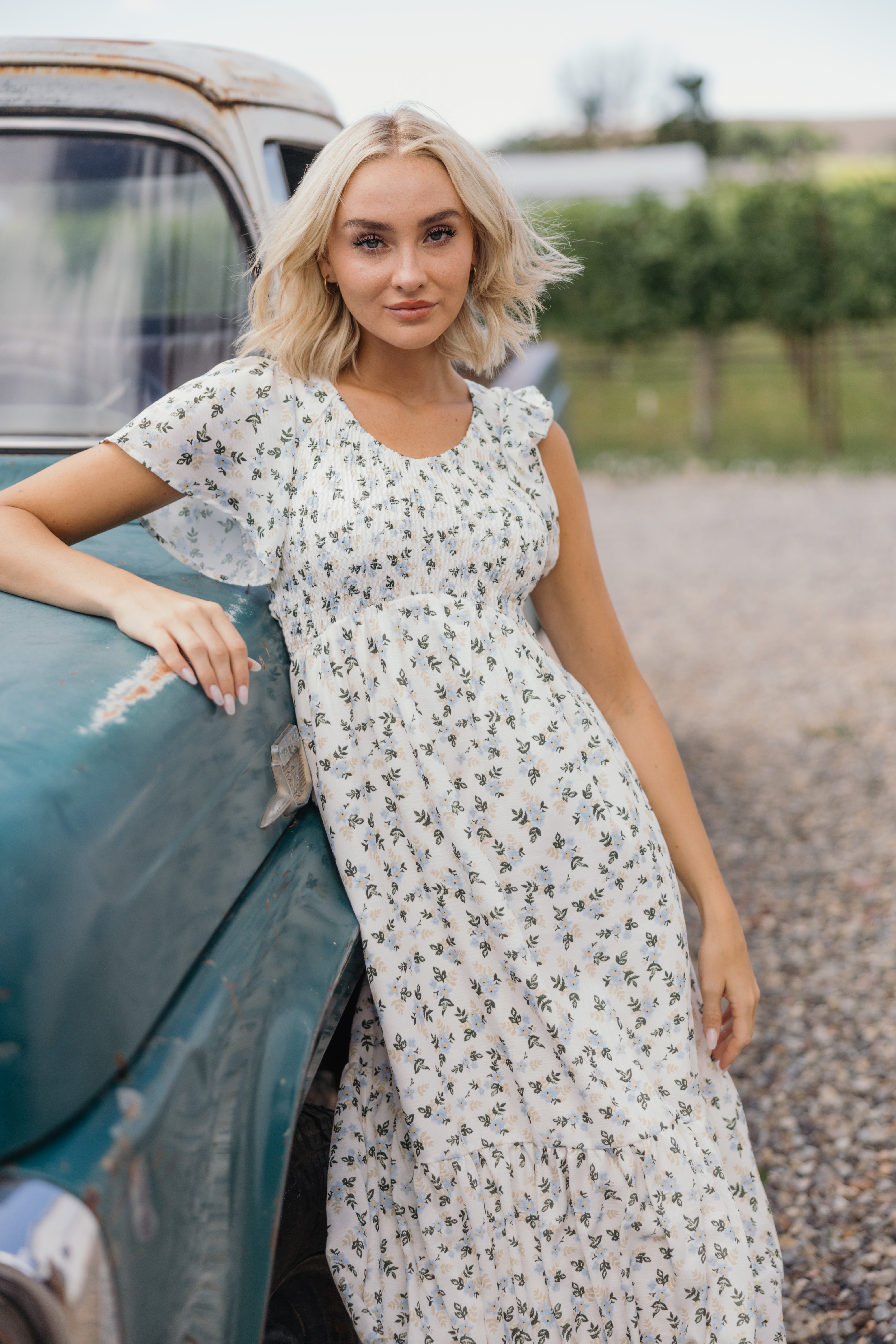 This expertly designed midi dress will elevate your wardrobe with a blue and cream floral pattern on an ivory fabric. It has flowy sleeves and a flowy skirt to keep you feeling stunning all day long. It's ruching, pockets, keep you looking stunning. And last but not least, one final touch, the v-neck.