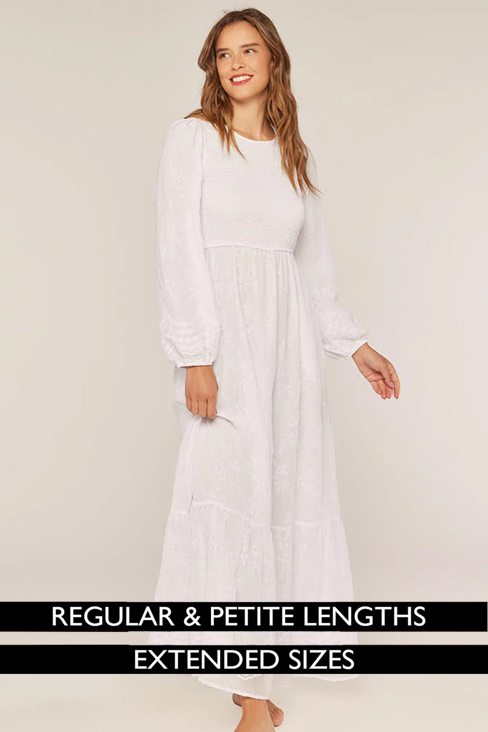 This charming white Temple dress has a smocked bodice, chiffon fabric with embroidered long sleeves and tiered skirt, a buttonhole closure at the back, full lining, and pockets. This dress runs slightly longer than the average temple dress