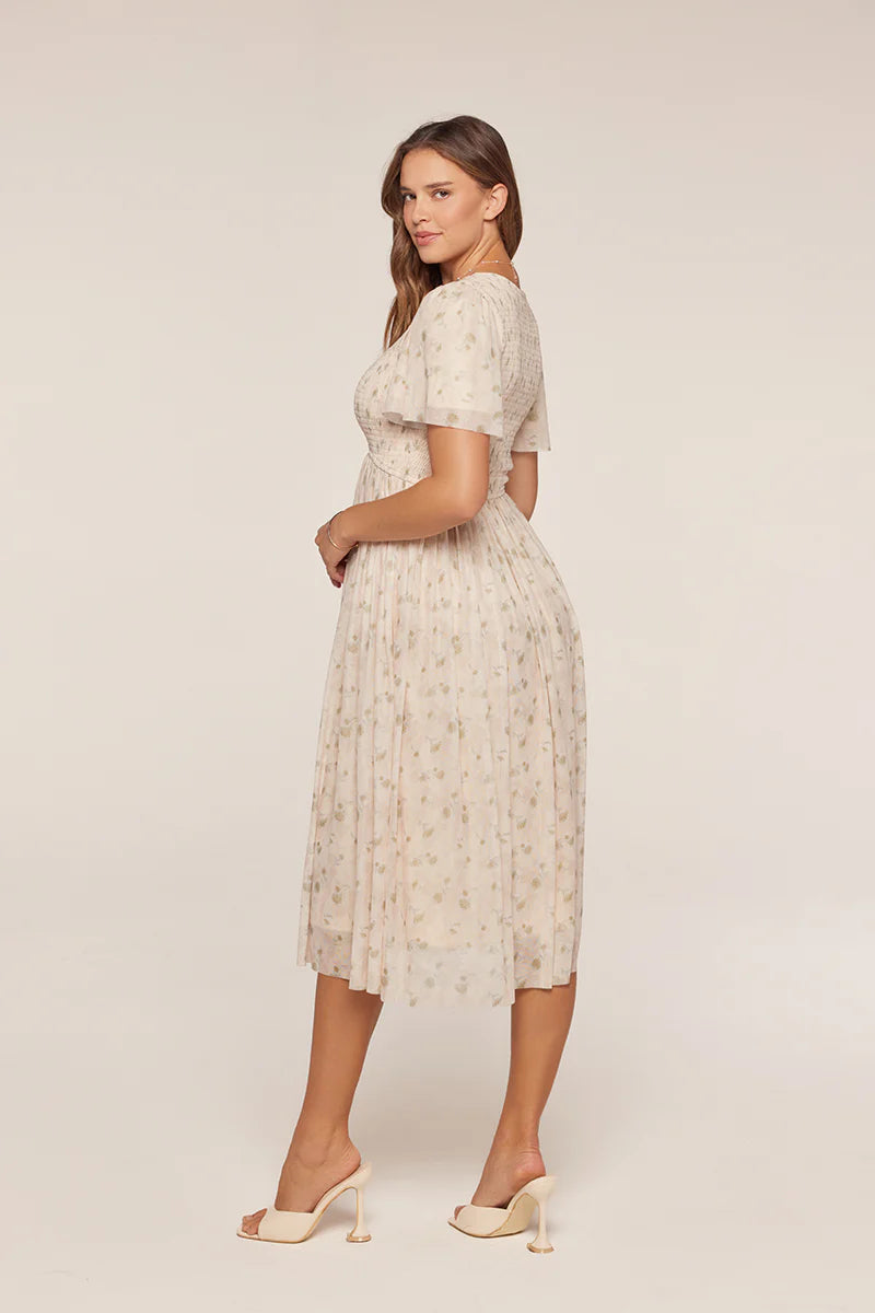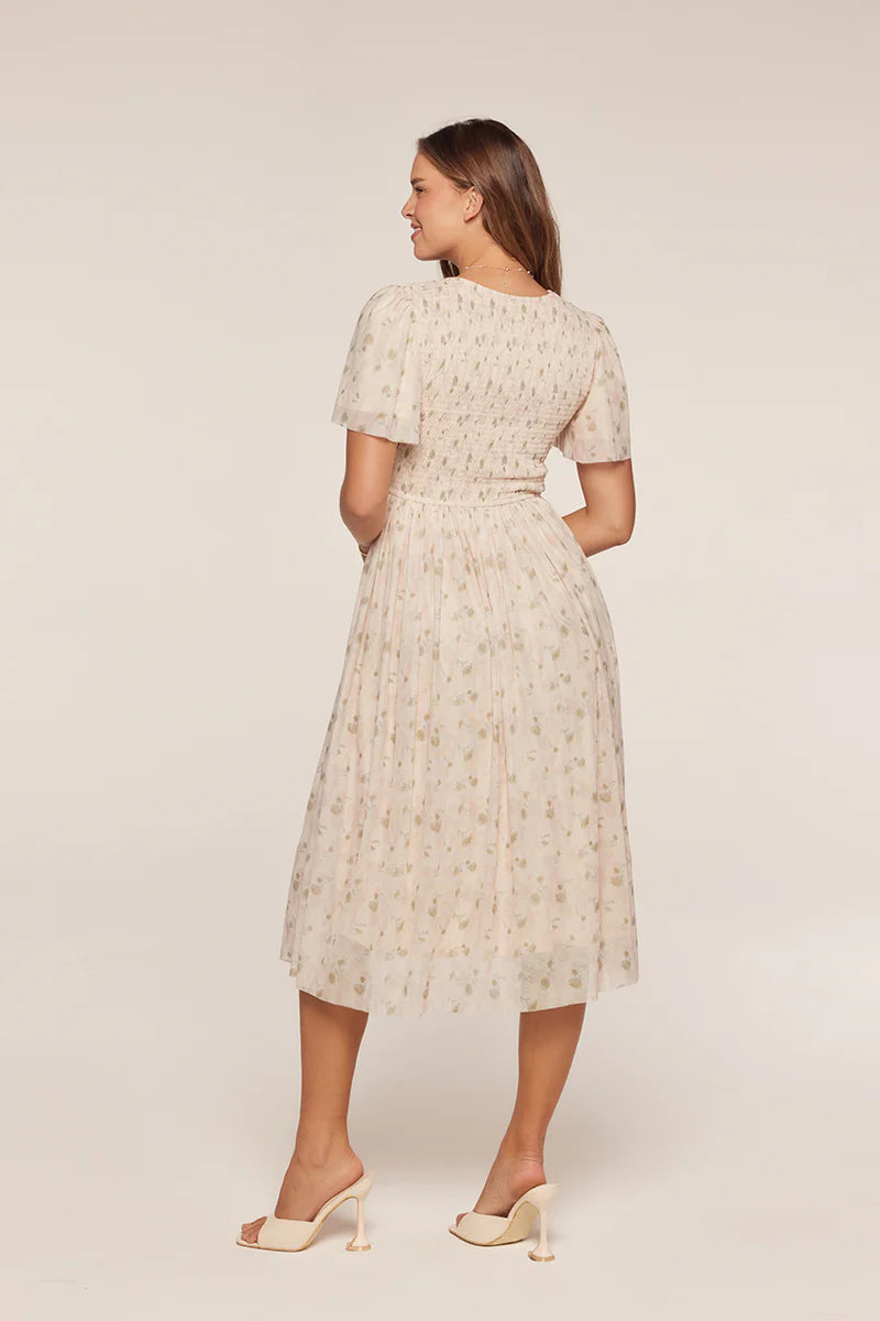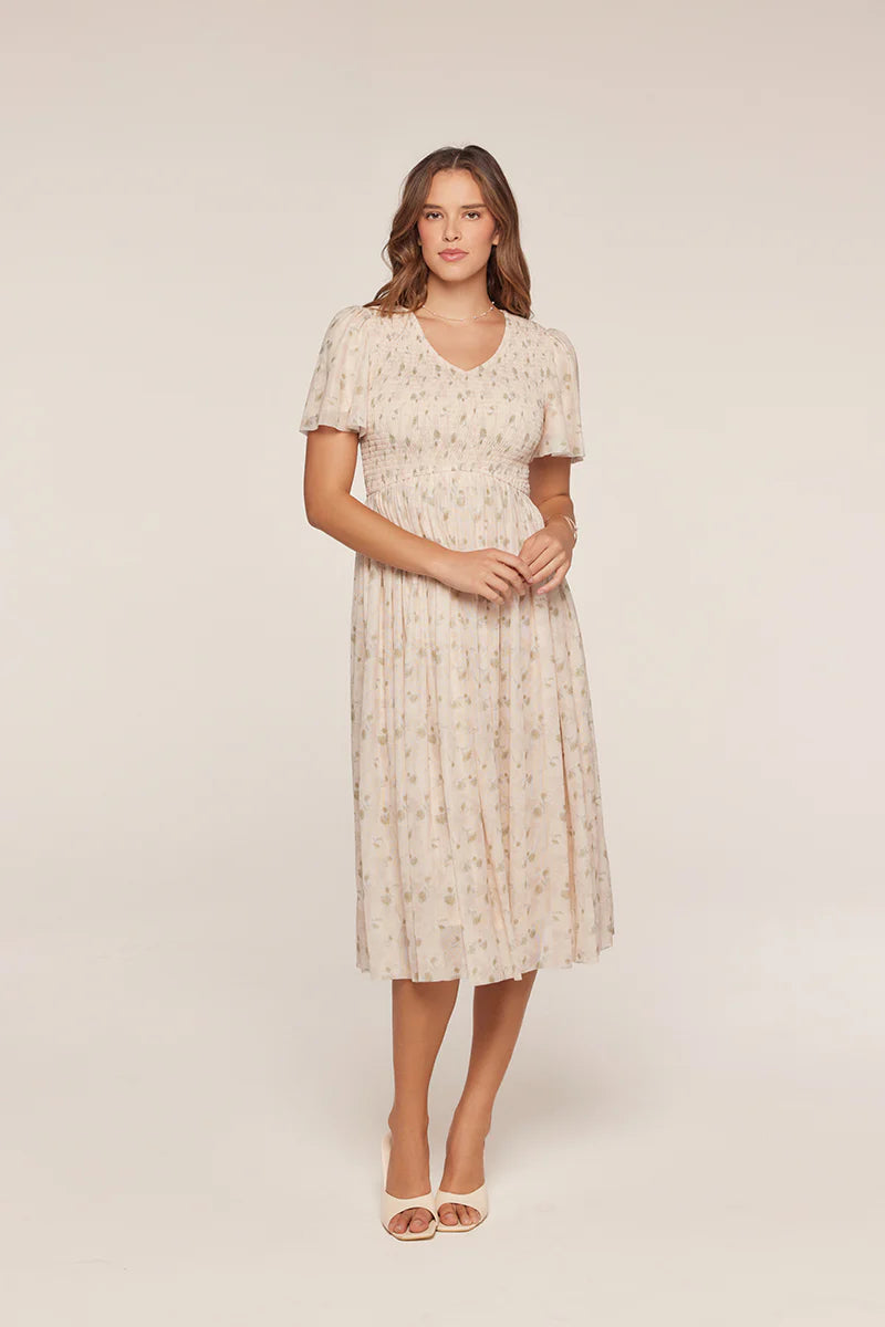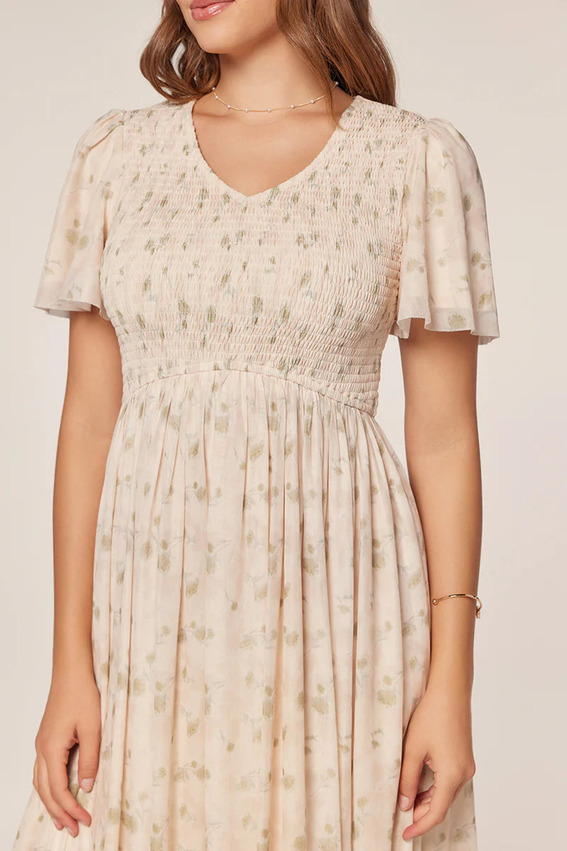 Meet your new go-to dress for effortless elegance. This cream beauty features a dreamy sage floral print that brings nature's palette to life. The smocked bodice creates a flattering silhouette while the flowy short sleeves keep you cool and comfortable. A V-neckline adds just the right touch of sophistication, and full lining ensures you're covered in style. Perfect for everything from brunch to garden parties.