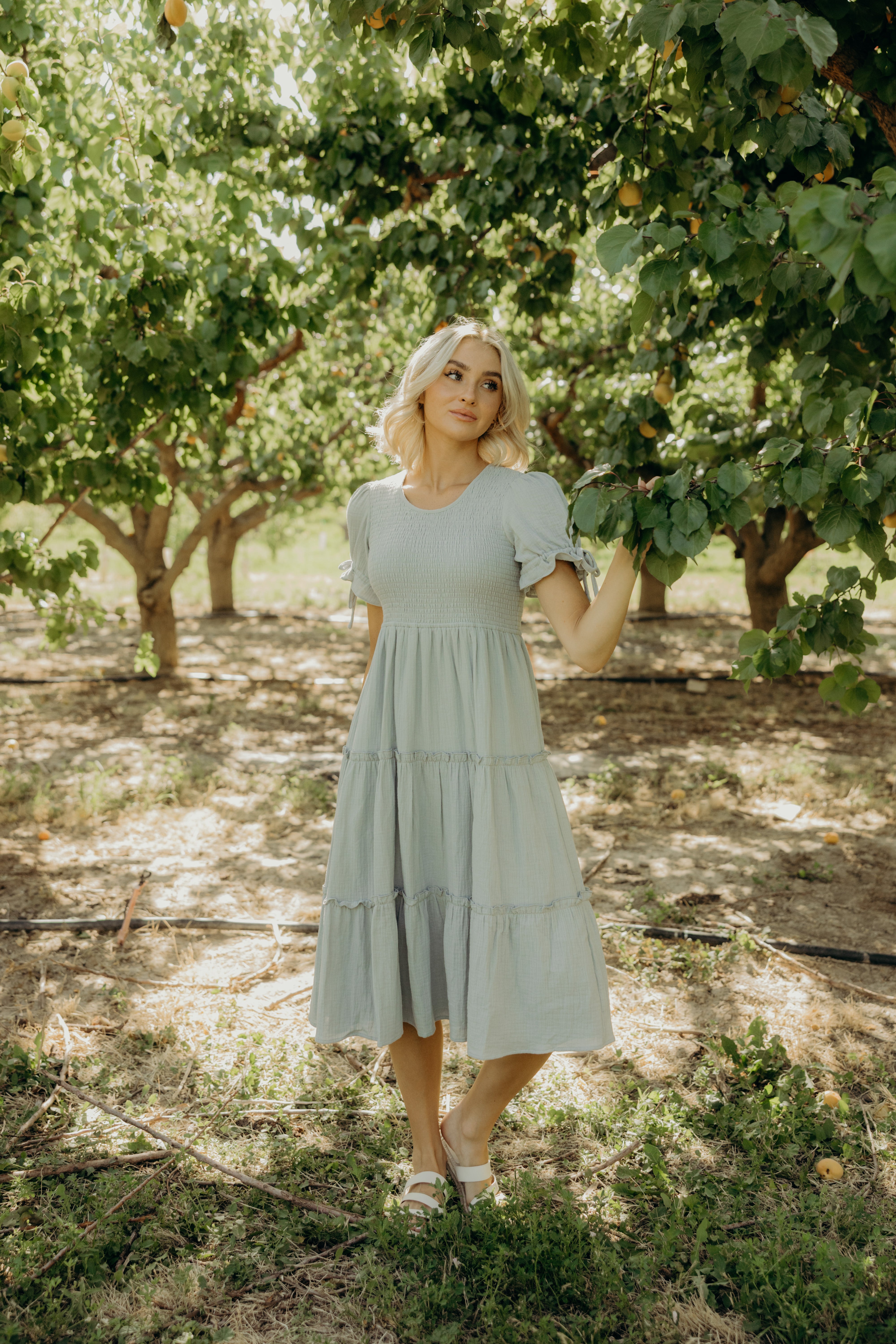 Step into this light blue midi dress featuring a smocked bodice, airy cotton gauze fabric, playful short sleeves with ties at the ends, a round neckline, tiered layers, and a comfy lining.