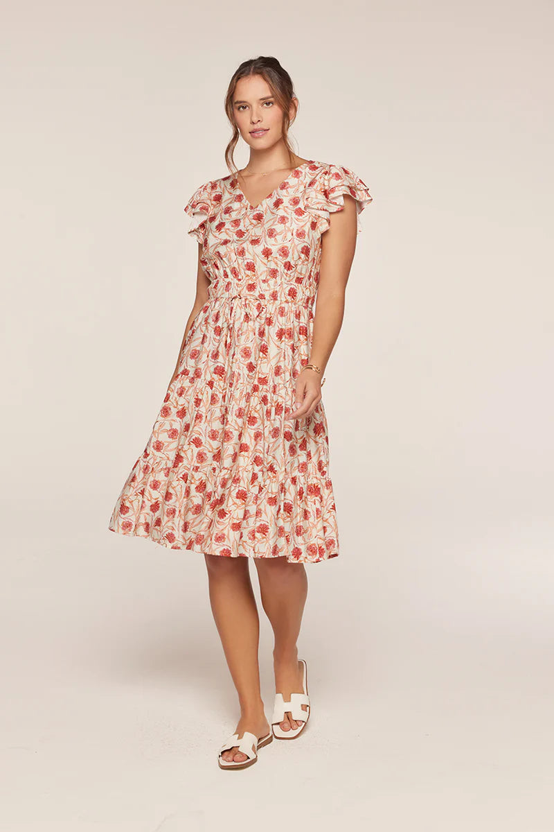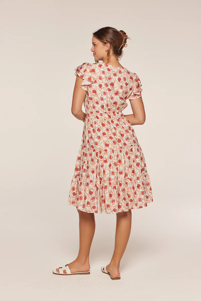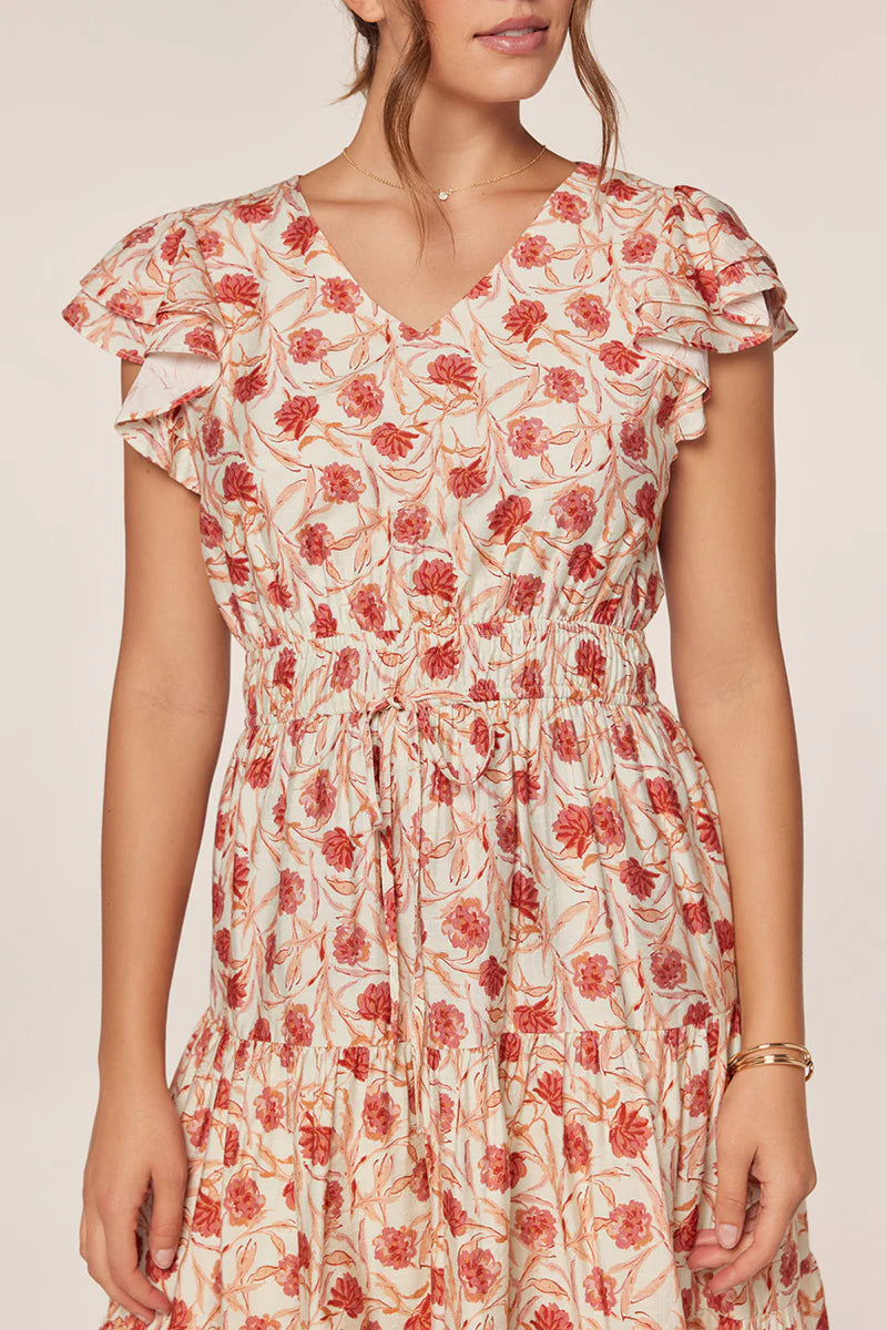 The Miele Tiered Ivory and Blush Dress is a romantic addition to any closet. Featuring a delicate pink and orange floral print on an ivory base, this dress offers a fresh, feminine aesthetic. The V-neckline and flowy short sleeves provide comfortable everyday wear, while the elastic waist with adjustable tie ensures a custom fit. Layered tiers create beautiful movement and dimension, and the lined skirt adds polish and coverage. Perfect for spring gatherings, casual dates, or whenever you want to feel effortlessly put-together.