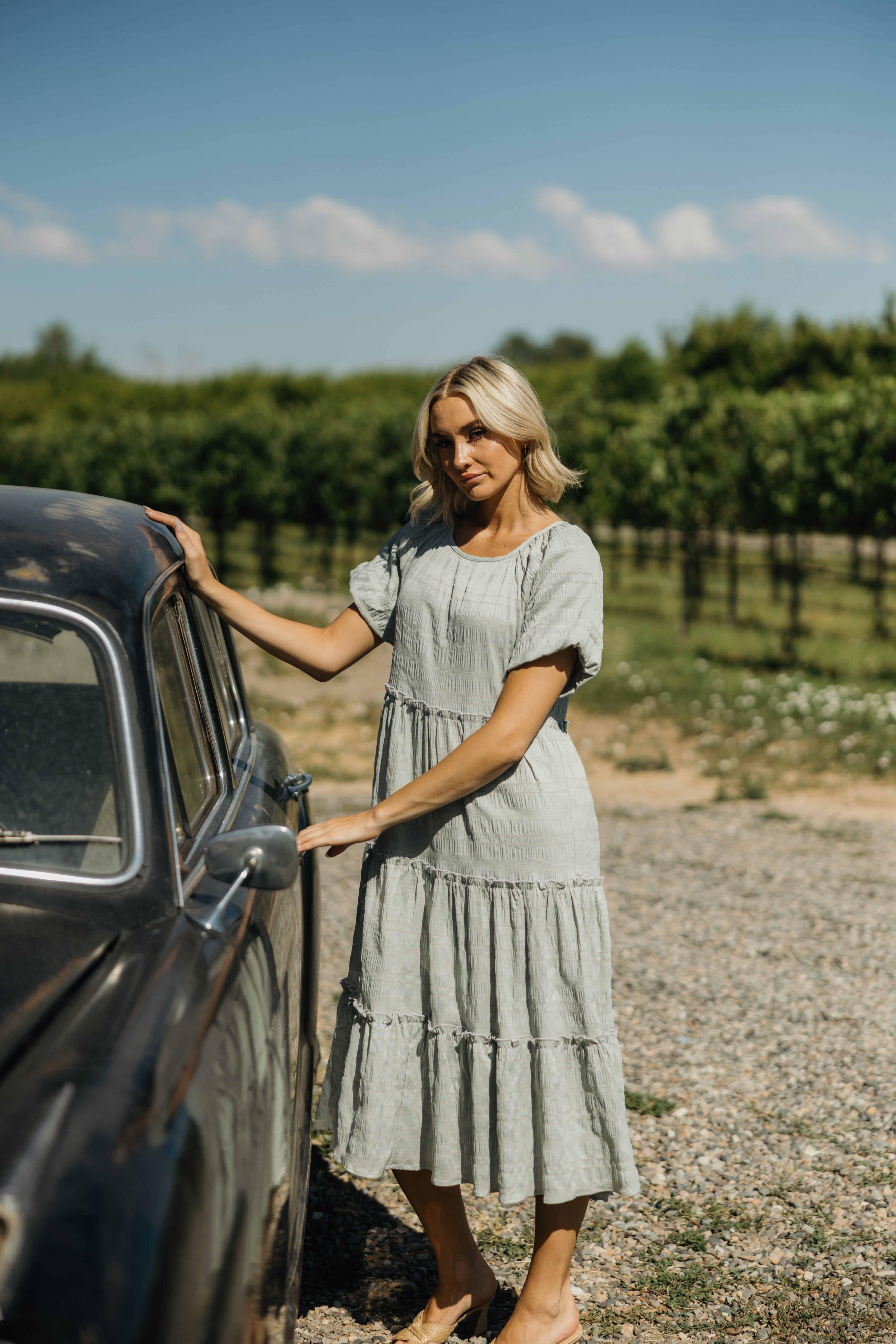 This fantastic dress in muted green is made with a woven fabric and features horizontal, spaced, shirred, striping in the weave that adds a fun and full texture! It also has a round neckline, short exaggeratedly puffed sleeves, a relaxed waist with a tiered shape with small ruffle bordering along the tops of the tiers, and an ankle length.