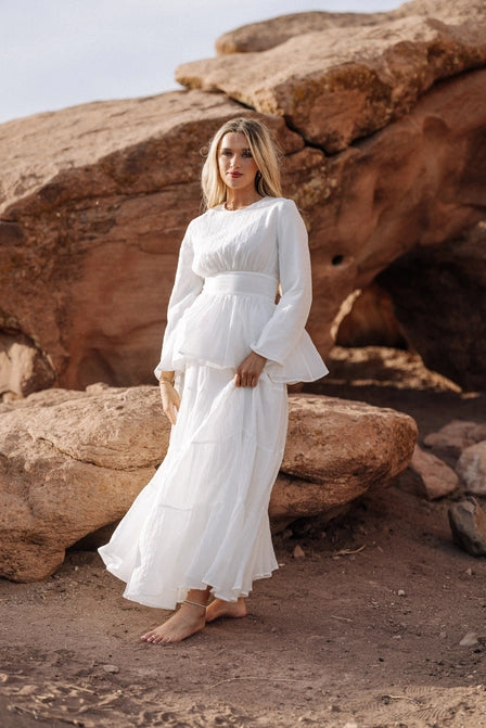 This playful Temple top in creamy white features long sleeves, a back zipper, fully lined and a banded waist with a ruffle below it. This has a matching skirt that is sold separately - The Stella Tiered Temple Skirt